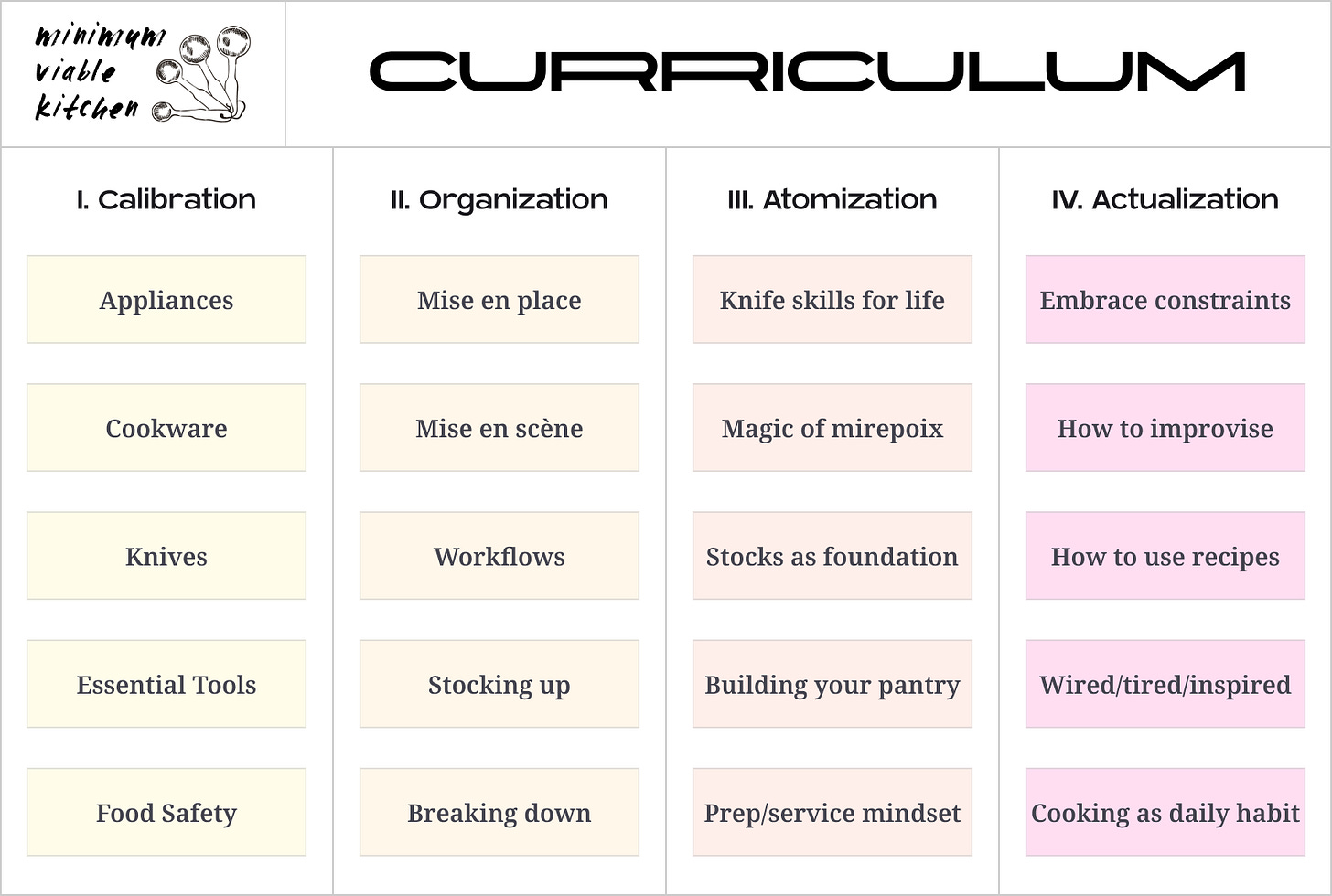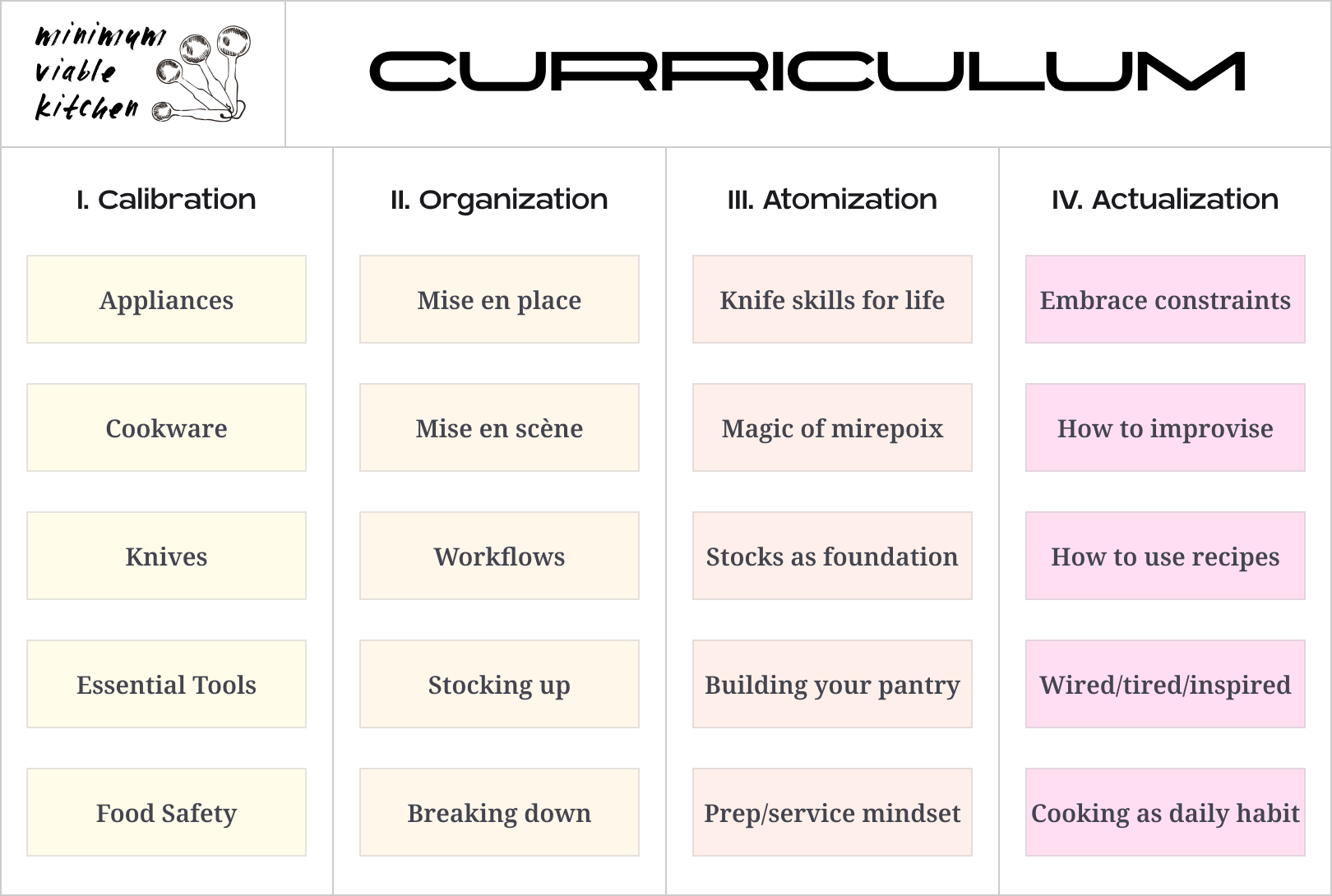 Minimum Viable Kitchen is the culmination of my two years in fine dining, a year of pandemic homecooking practice, and eight weeks of intense training during my On Deck fellowship. It’s the course I wish I had when I first tried to learn how to cook at 27.